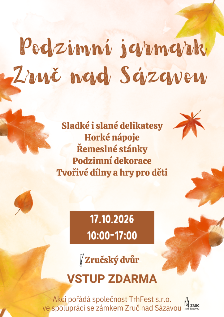 Srdečně vás zveme 17.10.2026 na Podzimní jarmark na ve Zručském dvoře, kde vás přivítá vůně čerstvě upečených dobrot. Zručský dvůr se promění v místo plné barev, tradic a poctivého řemesla.